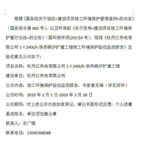 牡丹江熱電有限公司1×240t/h供熱鍋爐擴(kuò)建工程項(xiàng)目竣工環(huán)境保護(hù)驗(yàn)收監(jiān)測公示