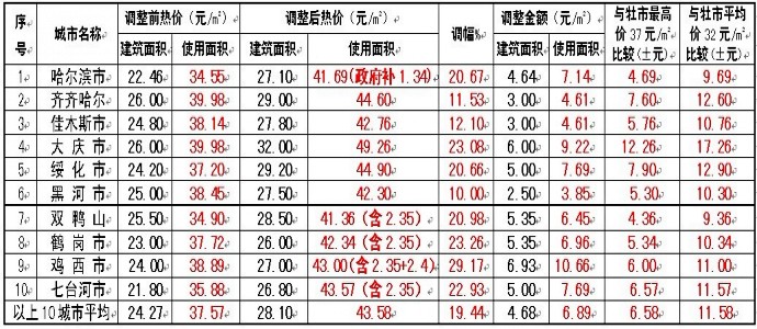 黑龍江省大中城市熱價調(diào)整比較一覽
